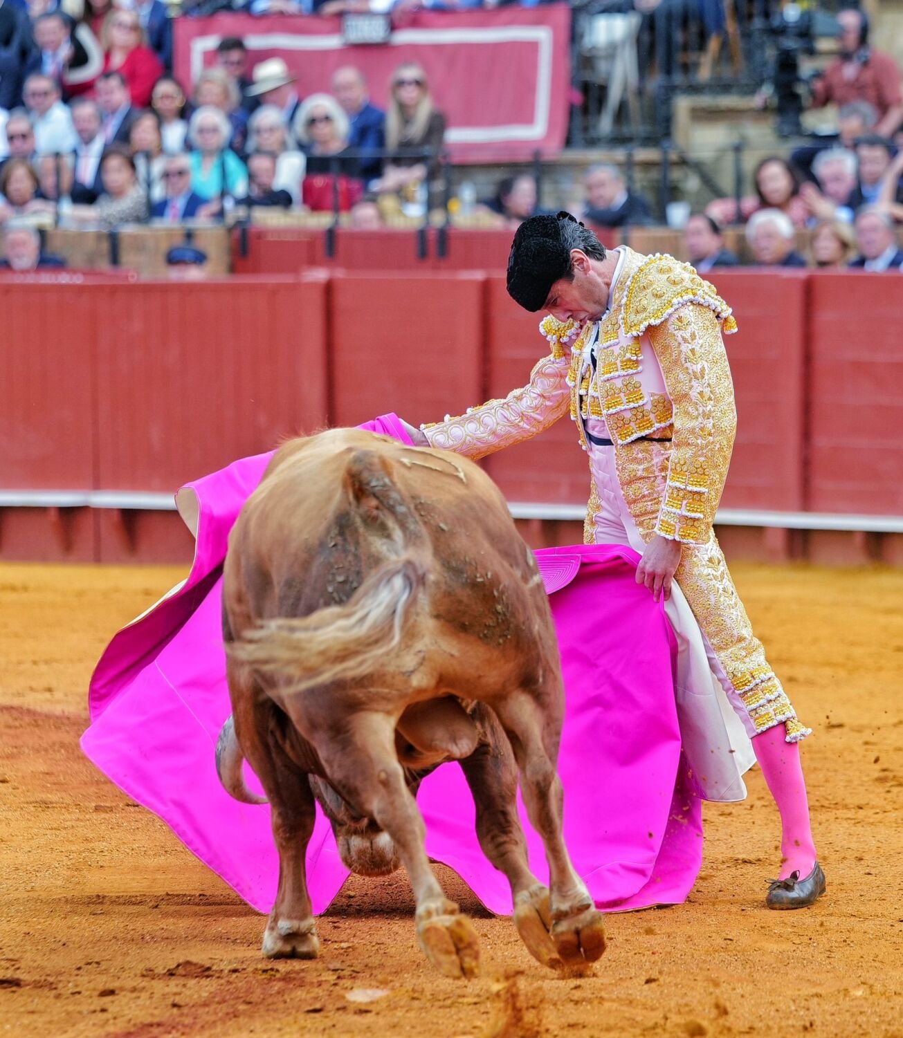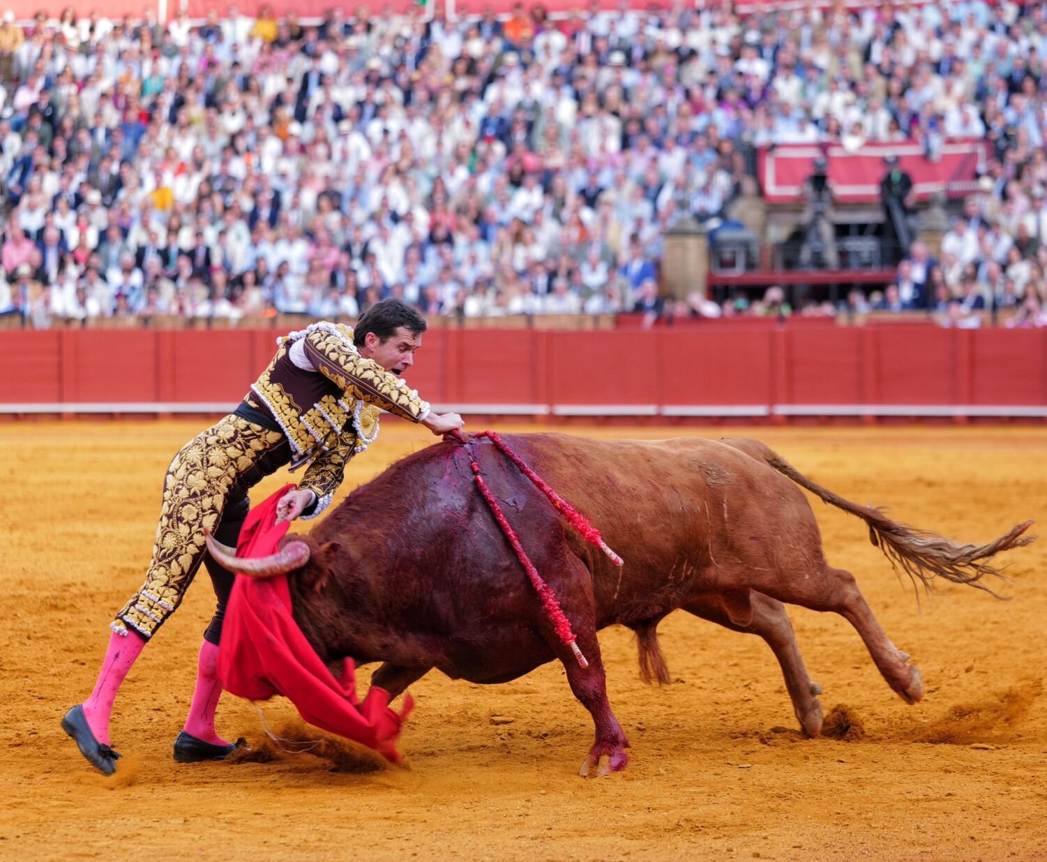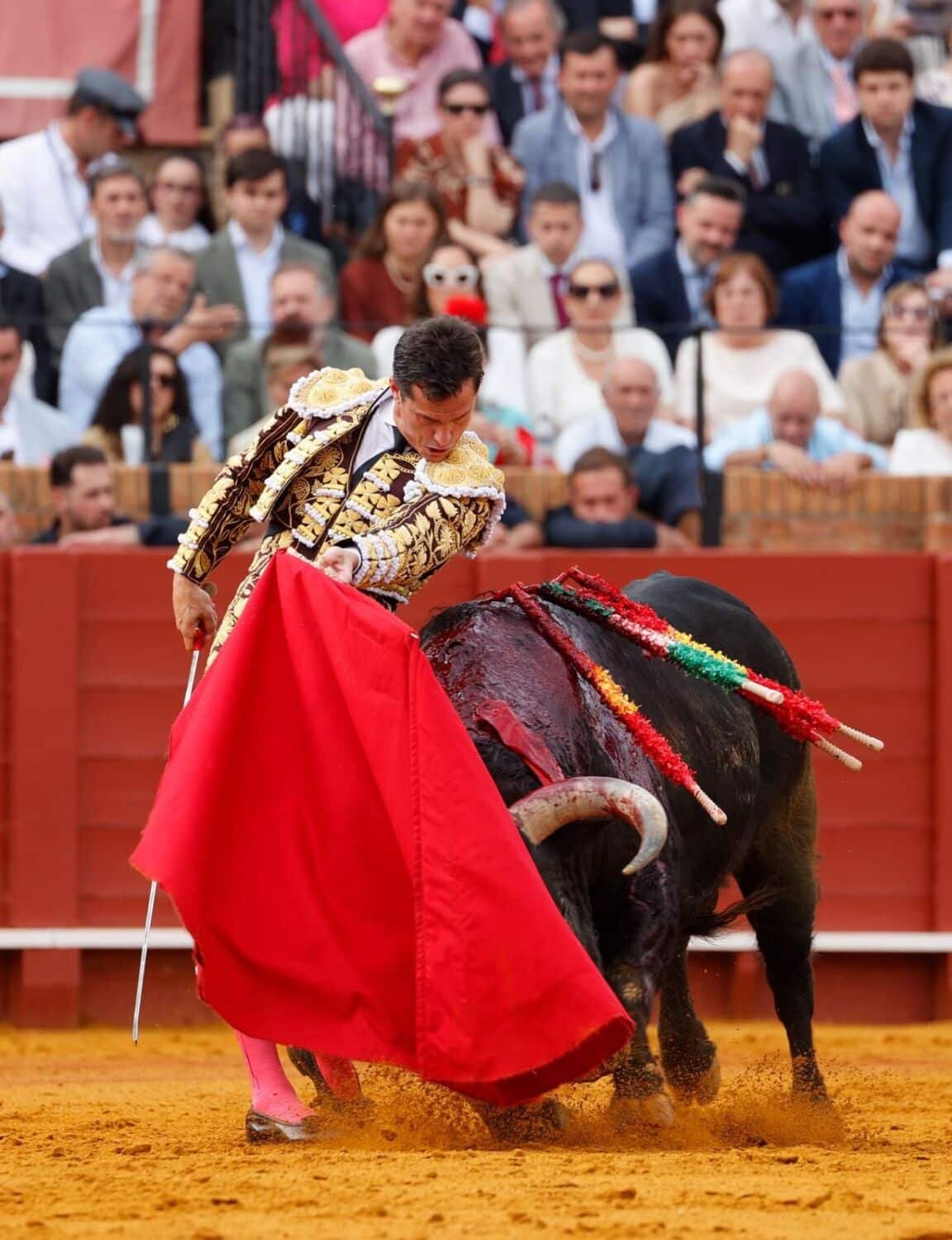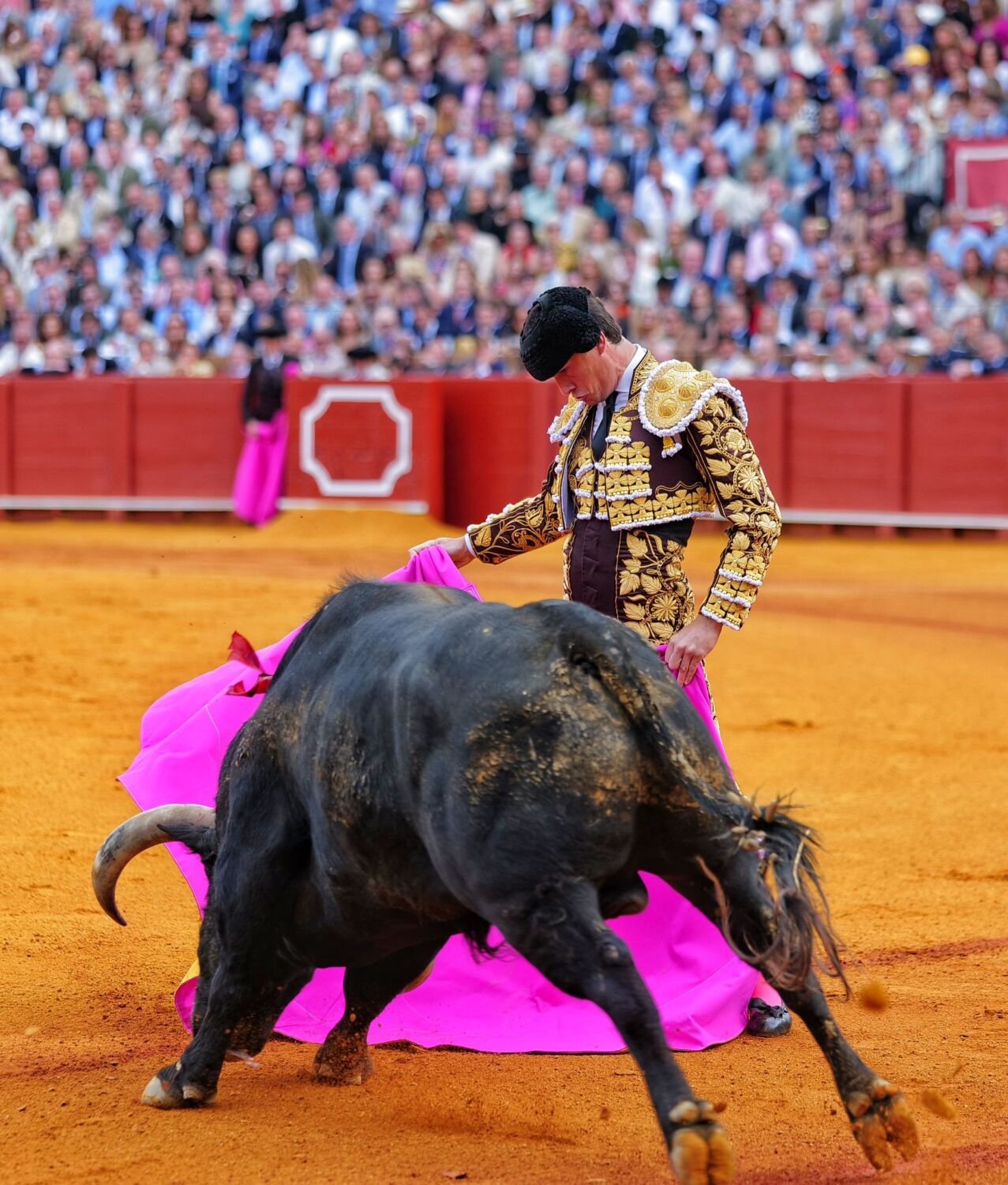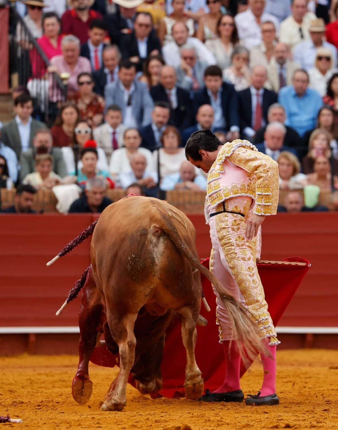 Otra tarde de lleno de “no hay billetes”, el 9° de ésta feria, una verdadera locura qué la feria taurina, haya “resucitado” tanta pasión, fidelidad, asistencia y seguimiento aún con las retransmisiones de Canal Sur y One Toro, estupendo balance económico para la empresa qué se estrena, con una climatología menos calurosa 23°; ante el encierro de Juan Pedro Domecq, trenzaron el paseíllo, DANIEL LUQUE.- (Azul ) Qué siempre tira palante, nunca se guarda algún ahorro para el hotel, el de Gerena asume digna, consciente y con mucha rresponsabilidad, su compromiso con Sevilla, de gran mérito, regular condición y gran maestría con serenidad y buen gusto, hoy precisamente ante el 4° “Botinero” dejó algunos pasajes bellos aprovechando las inercias, encendió el tendido con 3 naturales y dos derechazos ligados, después el animal se fué apagando y sacó cómo recurso las luquecinas, qué alegraron la concurrencia llegando a rematar con efectividad, cortando la única orejita del festejo ya que con el primero fue silenciado por las casi nulas fuerzas de su oponente. JUAN ORTEGA.- (Rosa pálido y oro) Con los diplomas y méritos del aroma y gusto de Sevilla, su principal activo el toreo suave, lento y parando el tiempo, con alma purísima y espíritu espléndido qué produce cuándo está entonado una intensidad con emoción romántica y profunda, tal vez uno de los únicos referentes, de Gitanillo de Triana o
