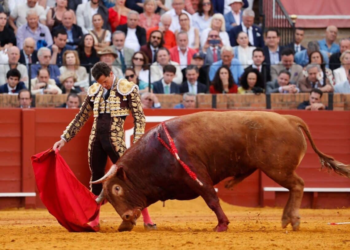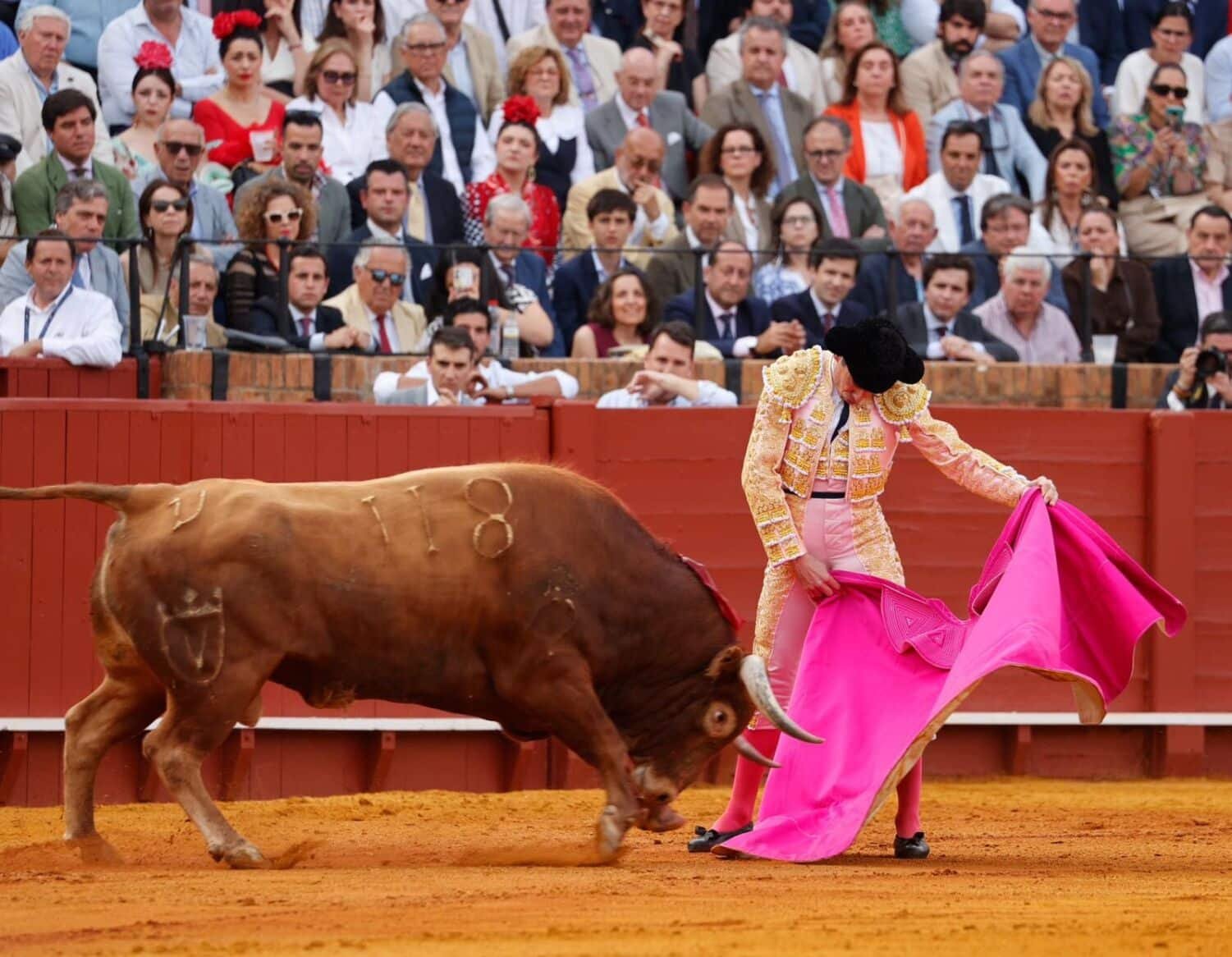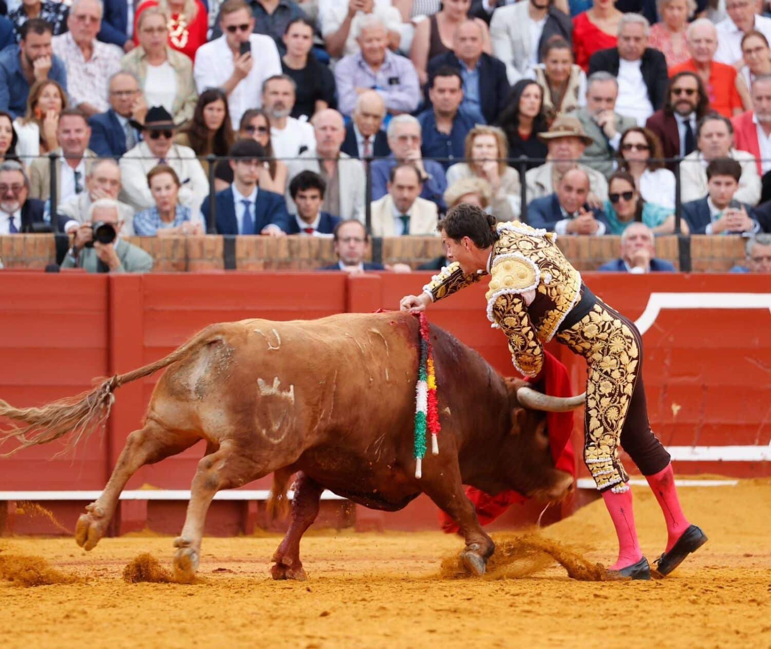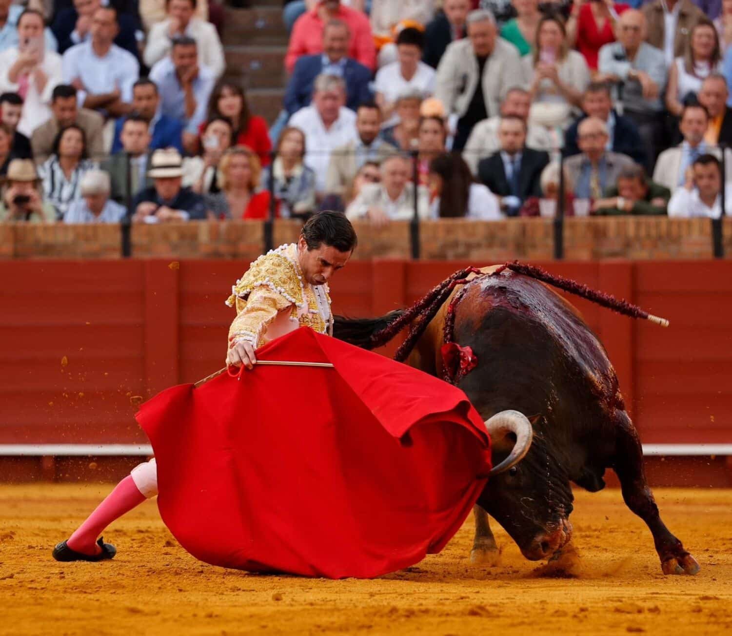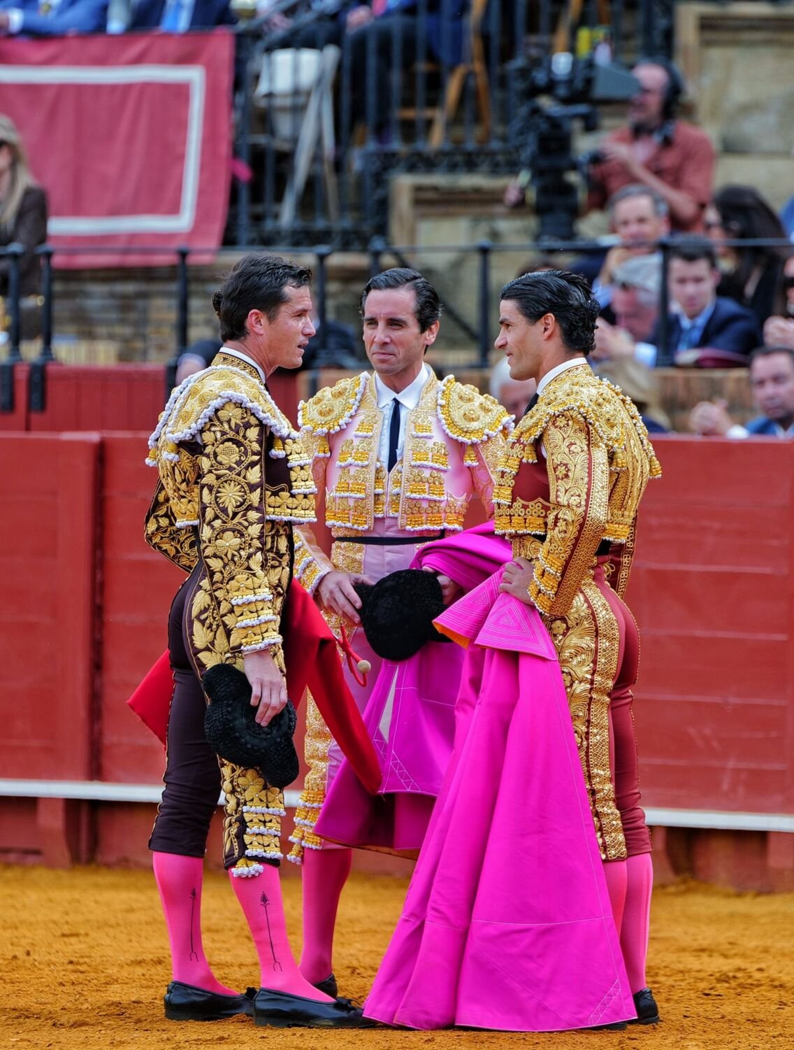 Otra tarde de lleno de “no hay billetes”, el 9° de ésta feria, una verdadera locura qué la feria taurina, haya “resucitado” tanta pasión, fidelidad, asistencia y seguimiento aún con las retransmisiones de Canal Sur y One Toro, estupendo balance económico para la empresa qué se estrena, con una climatología menos calurosa 23°; ante el encierro de Juan Pedro Domecq, trenzaron el paseíllo, DANIEL LUQUE.- (Azul ) Qué siempre tira palante, nunca se guarda algún ahorro para el hotel, el de Gerena asume digna, consciente y con mucha rresponsabilidad, su compromiso con Sevilla, de gran mérito, regular condición y gran maestría con serenidad y buen gusto, hoy precisamente ante el 4° “Botinero” dejó algunos pasajes bellos aprovechando las inercias, encendió el tendido con 3 naturales y dos derechazos ligados, después el animal se fué apagando y sacó cómo recurso las luquecinas, qué alegraron la concurrencia llegando a rematar con efectividad, cortando la única orejita del festejo ya que con el primero fue silenciado por las casi nulas fuerzas de su oponente. JUAN ORTEGA.- (Rosa pálido y oro) Con los diplomas y méritos del aroma y gusto de Sevilla, su principal activo el toreo suave, lento y parando el tiempo, con alma purísima y espíritu espléndido qué produce cuándo está entonado una intensidad con emoción romántica y profunda, tal vez uno de los únicos referentes, de Gitanillo de Triana o