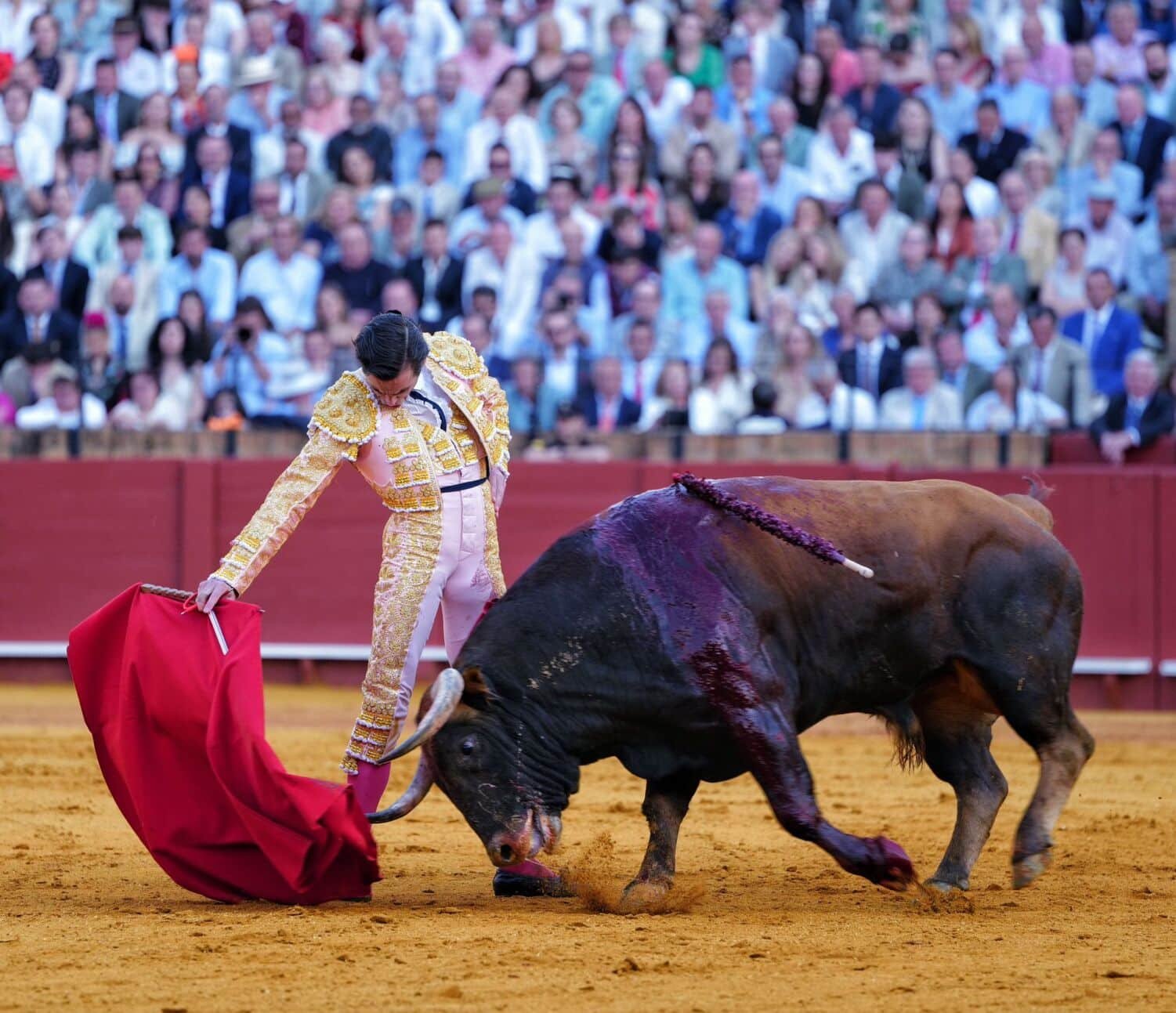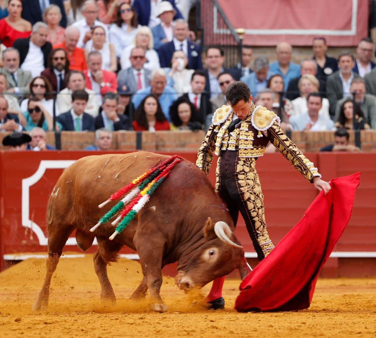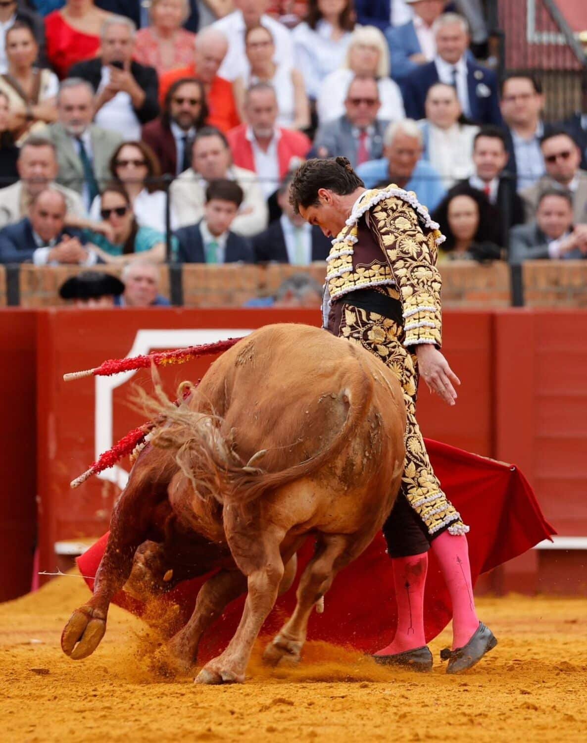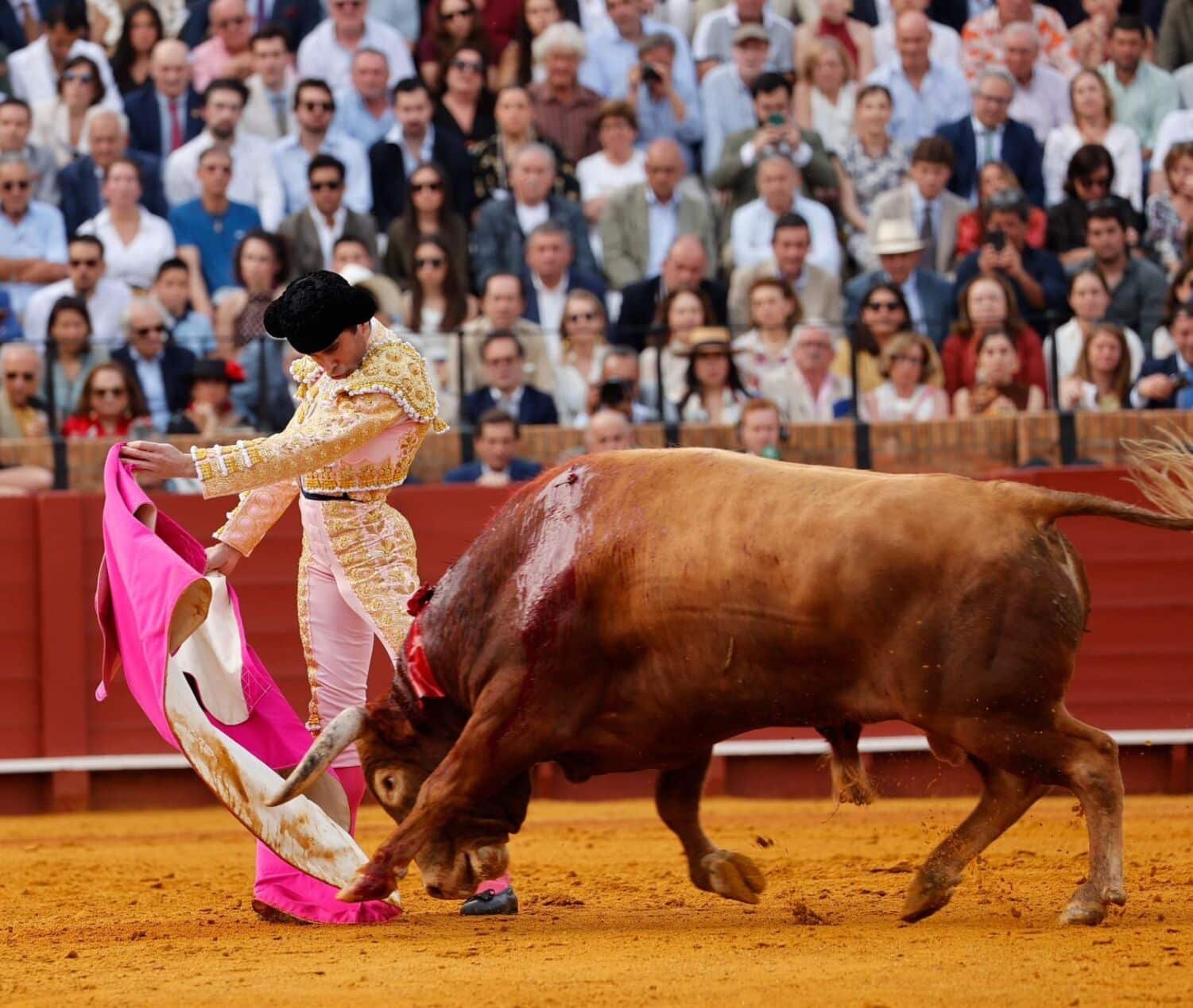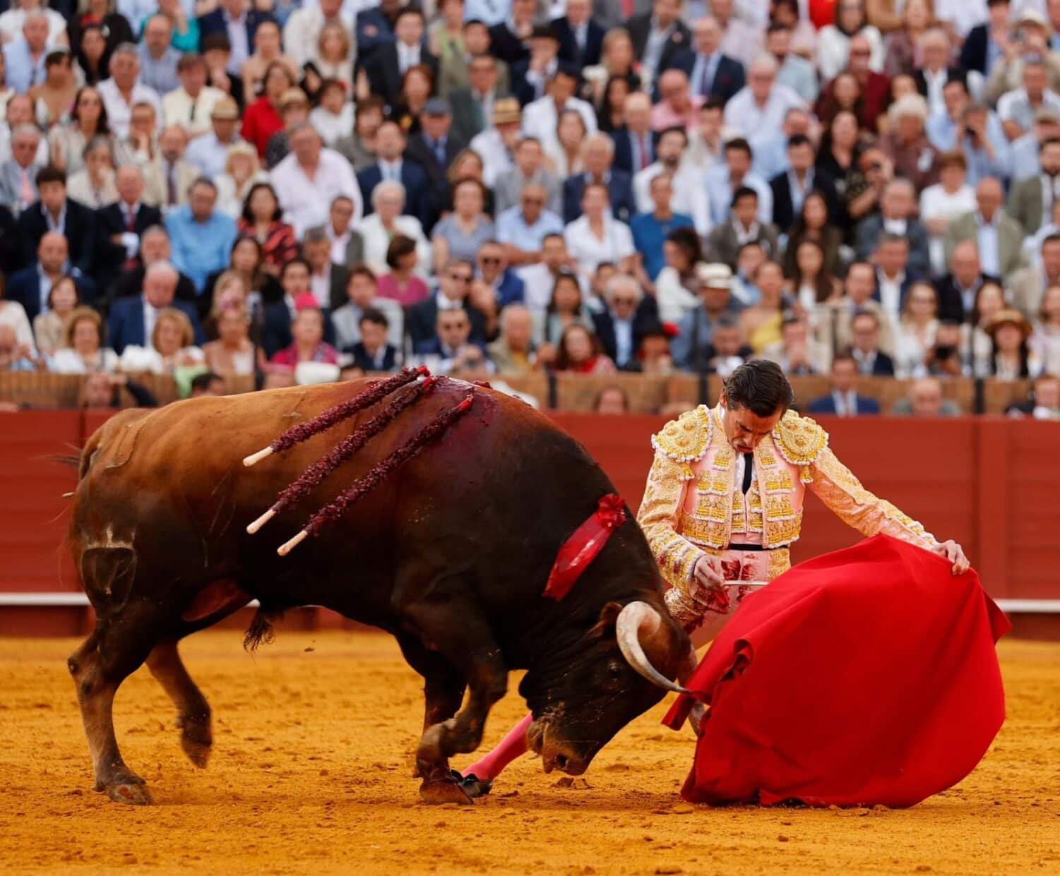 Otra tarde de lleno de “no hay billetes”, el 9° de ésta feria, una verdadera locura qué la feria taurina, haya “resucitado” tanta pasión, fidelidad, asistencia y seguimiento aún con las retransmisiones de Canal Sur y One Toro, estupendo balance económico para la empresa qué se estrena, con una climatología menos calurosa 23°; ante el encierro de Juan Pedro Domecq, trenzaron el paseíllo, DANIEL LUQUE.- (Azul ) Qué siempre tira palante, nunca se guarda algún ahorro para el hotel, el de Gerena asume digna, consciente y con mucha rresponsabilidad, su compromiso con Sevilla, de gran mérito, regular condición y gran maestría con serenidad y buen gusto, hoy precisamente ante el 4° “Botinero” dejó algunos pasajes bellos aprovechando las inercias, encendió el tendido con 3 naturales y dos derechazos ligados, después el animal se fué apagando y sacó cómo recurso las luquecinas, qué alegraron la concurrencia llegando a rematar con efectividad, cortando la única orejita del festejo ya que con el primero fue silenciado por las casi nulas fuerzas de su oponente. JUAN ORTEGA.- (Rosa pálido y oro) Con los diplomas y méritos del aroma y gusto de Sevilla, su principal activo el toreo suave, lento y parando el tiempo, con alma purísima y espíritu espléndido qué produce cuándo está entonado una intensidad con emoción romántica y profunda, tal vez uno de los únicos referentes, de Gitanillo de Triana o